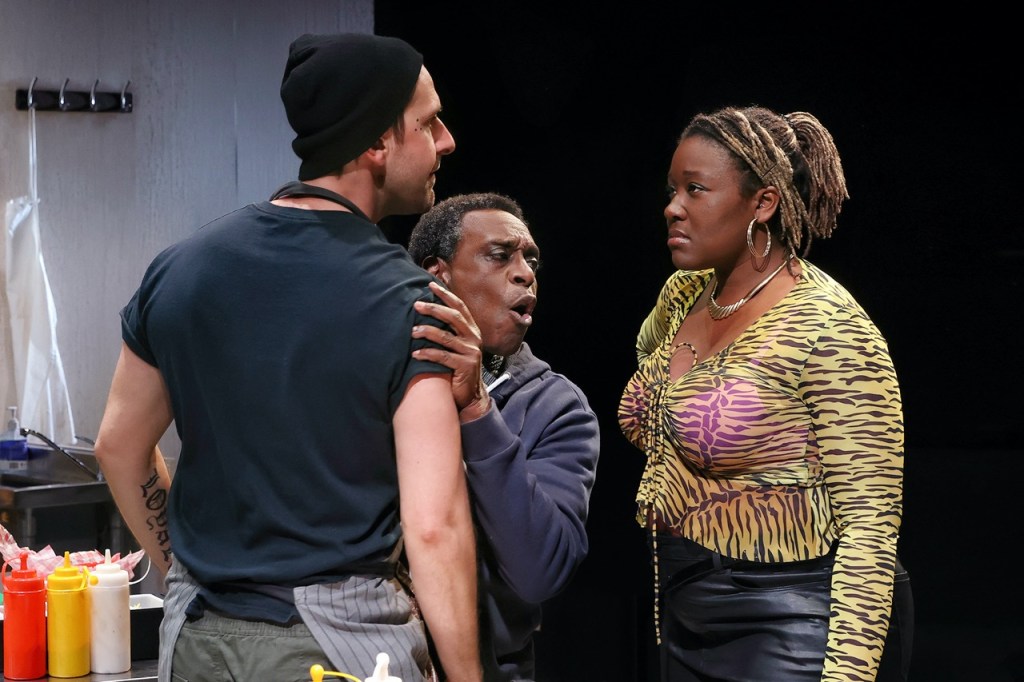 There is a mad-cap, workplace sit-com energy to Clyde’s. The eponymous boss is like a nasty Krammer crashing through Seinfeld’s door, causing chaos and belittling her team. Montrellous’ patience seems to be almost absolute, while Letitia and Rafael flirt and Jason reveals himself to be more than he seems. Nottage’s dialogue is snappy, and by juxtaposing the gritty reality of the kitchen to the descriptions of their dream sandwiches (“Maine lobster on a potato roll with truffle mayo, caramelised fennel and a touch of dill” etc) it sells the aspirational dreams of these ex-cons looking for a better life.