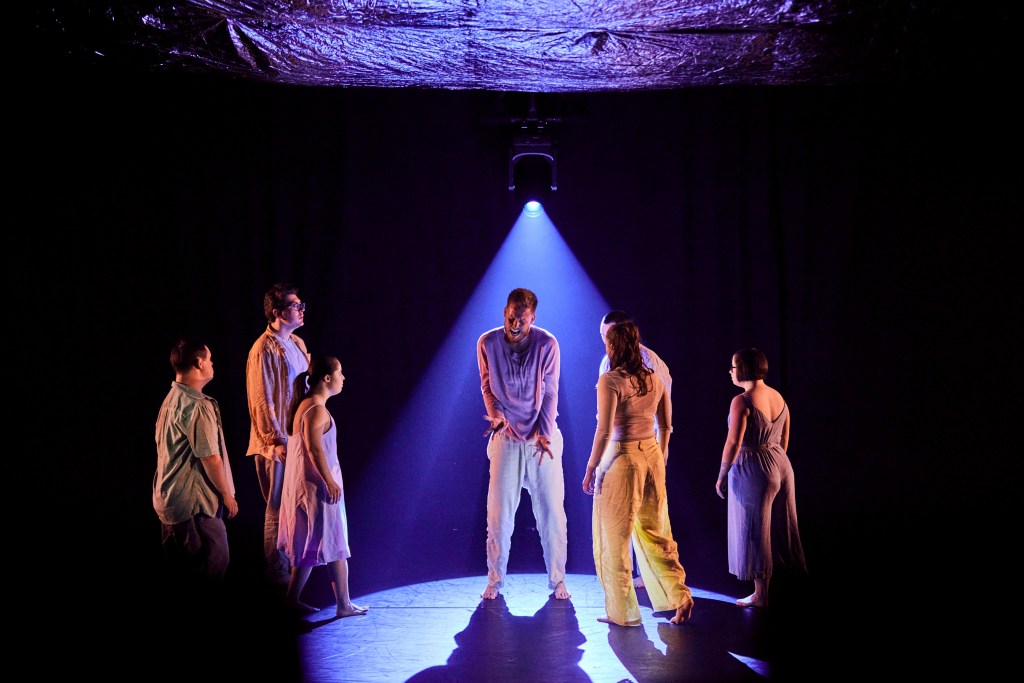 All these elements combine to put the focus on the dancers. I’m not an expert on dance, so I’m approaching this from the point of view of an interested punter. Ryan’s choreography (devised with the ensemble) works with the bodies on stage and works around their limitations. It’s filled with humour and heart. One moment, with a dancer simply pushing others around with his feet, is charmingly innocent and playful, while others are laced with confusion and violence.