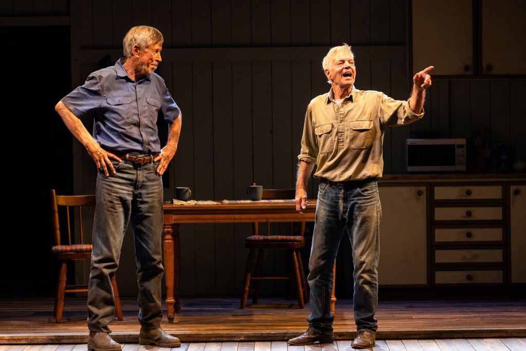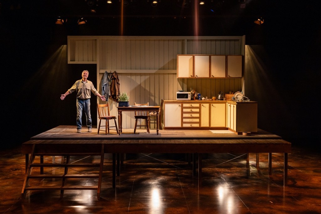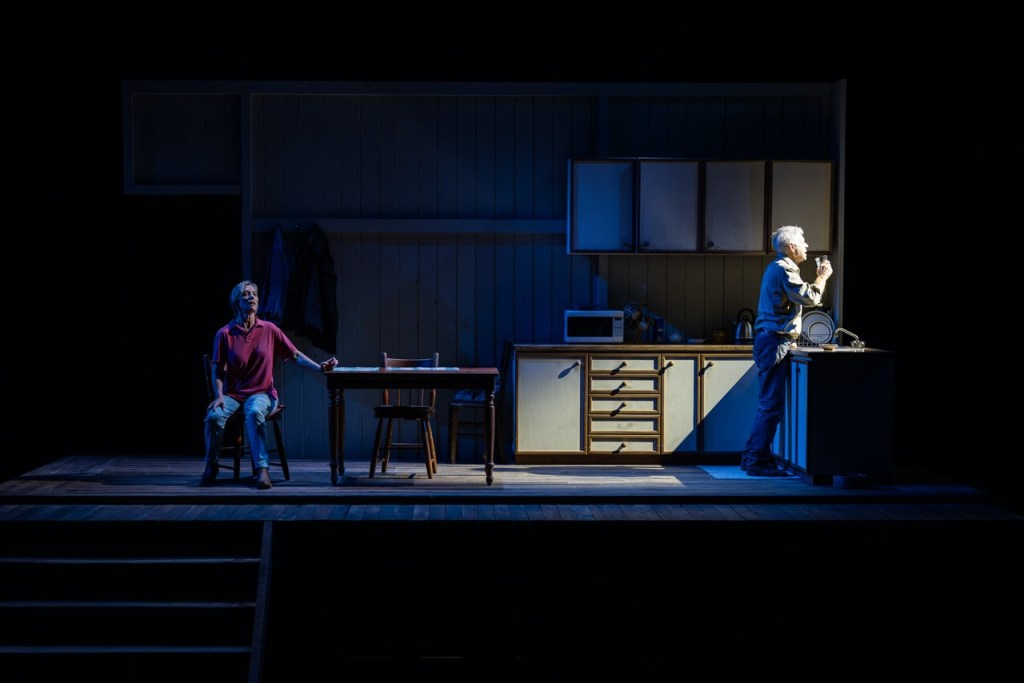 Playwright Angus Cerini’s Wonnangatta was one of the first pieces of theatre I saw back in Australia after returning over Covid, with its dark Australian-gothic tones, fever-dream-like pacing and focused central performances – I loved it. With Into The Shimmering World, his characters are more laconic but through their limited use of vocabulary and repeated phrases, Cerini plays with rhythm and subtext. One of the funniest scenes see’s taciturn Ray being coaxed into saying “I love you” by his adult son, that turns into a Meisner-esque struggle of intention, repetition and very human comedy. It also marks the divide between his university educated son and himself.