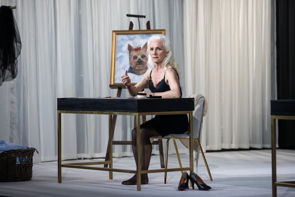 The President is a proverbial game of two halves. In Act One, Fouéré’s First Lady prepares to attend another in a long line of funerals she’s had to attend thanks to the anarchists who are terrorising the unnamed nation which she and The President (Weaving) rule over. The President is in the bathroom, bathing and having a massage, after a near-miss assassination attempt. But the First Lady is less concerned about that than she is about the death of her beloved dog – who had a heart attack during the commotion. As she is attended by her maid Mrs Frolick (an outstanding Julia Forsyth), she descends into barely controlled madness.