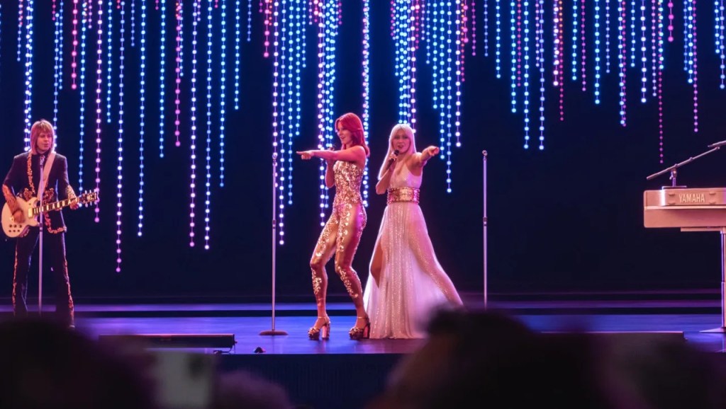 At some point, the pretence of reality is thrown to the curb. As the quartet performs, side screens show close ups like any regular concert… except there are no cameras on stage to capture the angles. At times, it is less a “live concert” and more of an immersive music video with no pretence at physical reality. After carefully constructing a blend of real and fake, the show accepts its limitations and plays with its boundaries. There is banter with the audience, but it feels plastic and artificial. When they play genuine footage of ABBA performing ‘Waterloo’ at the Eurovision Song Contest, the flat verisimilitude draws a strong, positive emotional response.