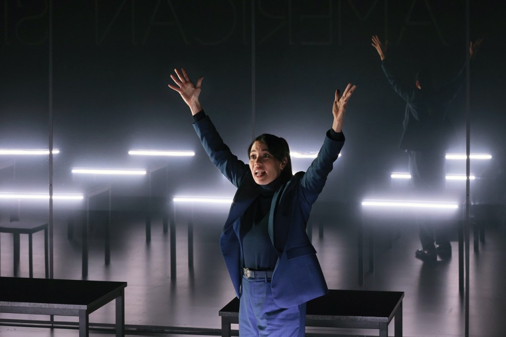 While the subject matter is nothing particularly new, it’s very well presented. Designer James Lew and Lighting Designer Benjamin Brockman have created a set of sharp lines and neon that easily takes us from an office, to a factory, to a shop, a chapel and a hotel room without distraction. The rear wall of mirrors keeps us, the audience, in the picture at all times, and a single laptop flashes phrases of jargon like chapter headings. Into this cold, inorganic space, Văn-Davies is at once part of the furniture, then an agent of disruption.