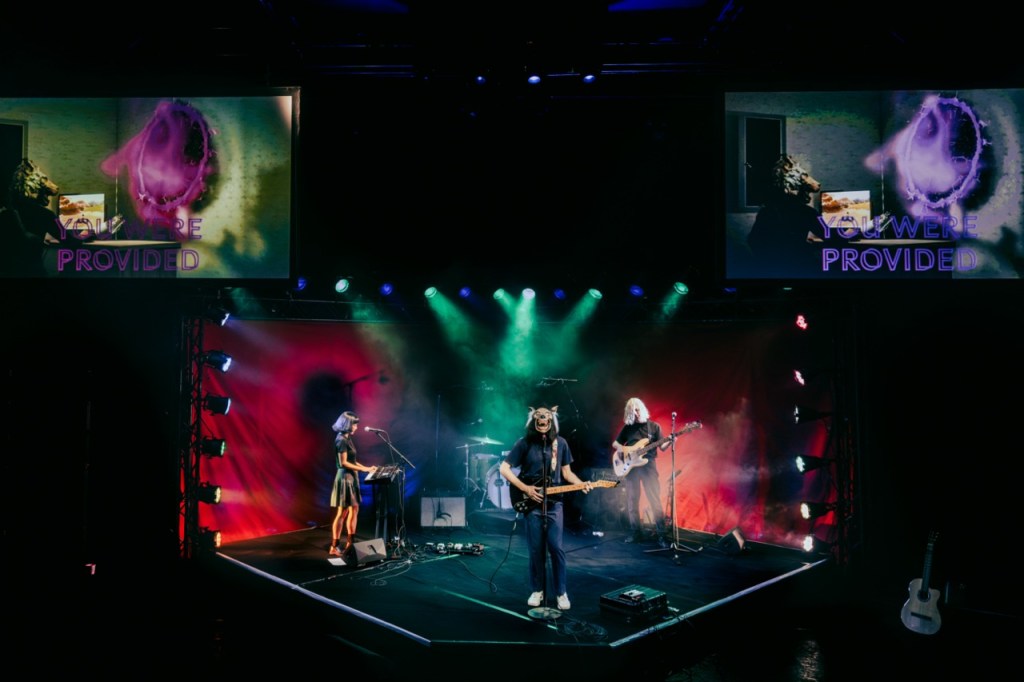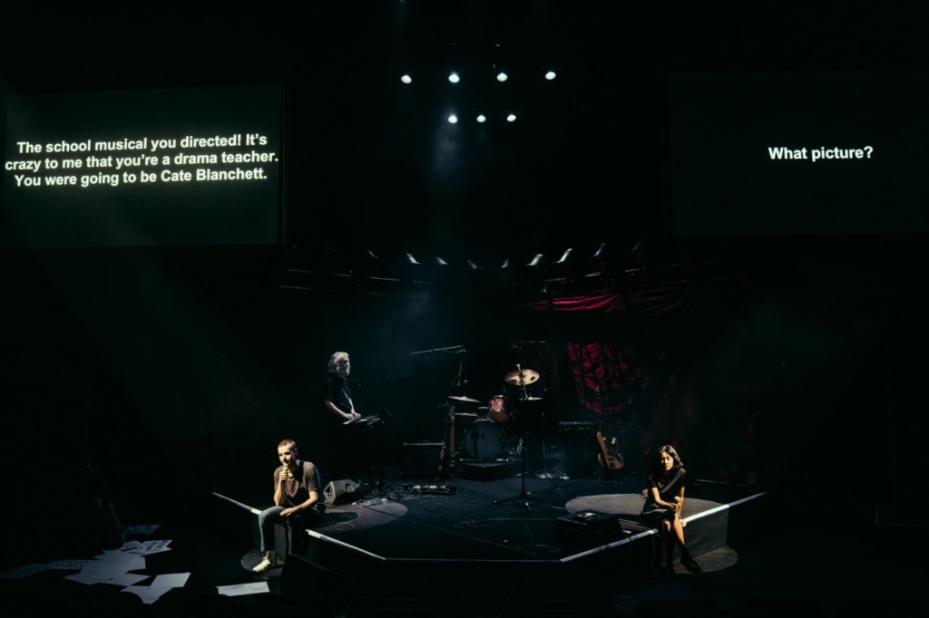 There is a sly sense of humour to the entire production that smirks but never sneers, and a juvenile shit-stirring vibe that keeps you guessing. There’s something in the lo-fi rock’n’roll set up that had me on edge the whole time, unsure which direction the narrative would go in. How dark would it get? The answer is, pretty fucking dark but always intriguing. It’s like watching Donnie Darko: The Musical. A brilliant third act rug pull drew gasps from the crowd and proved that re:group aren’t just masters of multimedia tech, they know how to really engage an audience with old school theatrical tools as well.