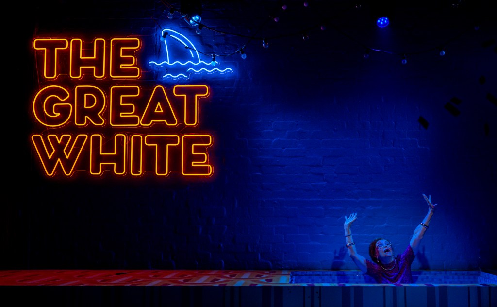 Nothing about Hot Tub feels like a 25a show. I say that as a compliment, but also as an existential inquiry. This show is so well presented it could easily be a mainstage show upstairs. A bespoke neon sign (13 letters, plus waves and a shark fin), carpentry, multiple costumes and props, not to mention a complete repaint of the theatre’s interior… they certainly got a lot of bang for their 25a (“less than $2500”) budget.