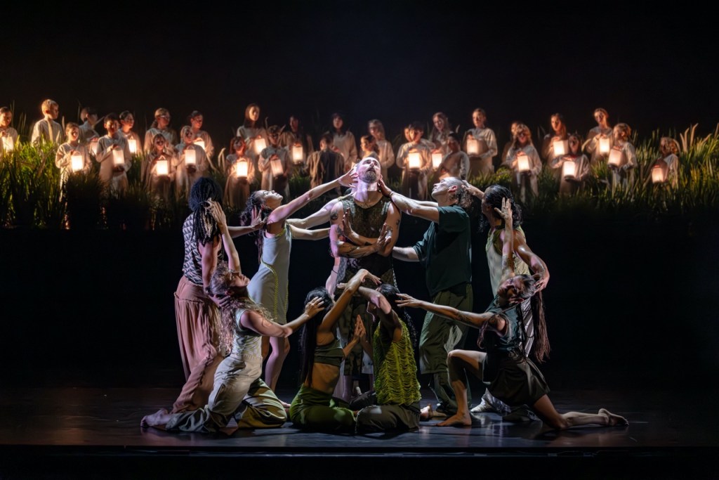Harriet Oxley’s costumes start off in muted natural tones with geometric prints before moving through a phase of more sexualised, revealing pieces, and then into stark blacks. Meanwhile, Bosco Shaw’s dynamic lighting design forms an integral part of the storytelling—the light is often confining and controlling, sometimes warm and elating. Set designer Charles Davis gives us a series of reveals, beginning sparse but gradually unveiling the natural world as both an oasis and a chaotic force.