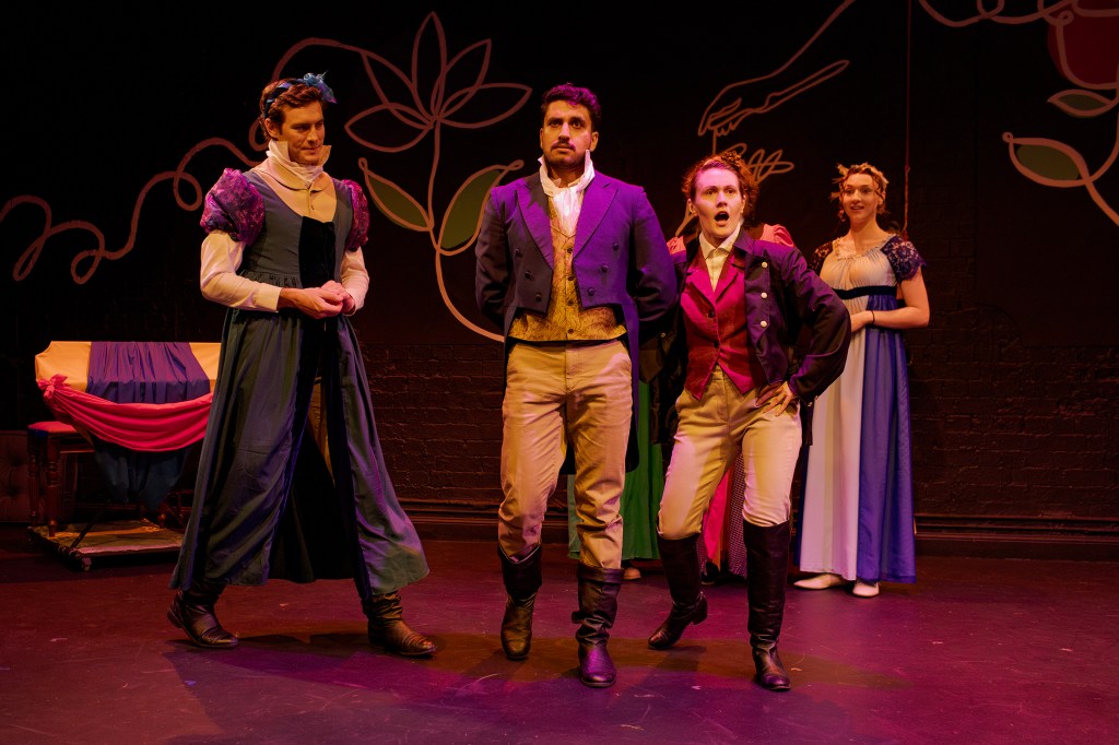 The cast of eight moves through a dizzying array of characters, frequently playing two at the same time. In this story of defying gender roles, the casting relies heavily on drag for easy laughs. AJ Evans hits the comedy beats hard as the scheming, overwrought Mrs Bennett. Steve Corner plays both Mr Bennett and Charlotte Lucas, Dylan O’Connor juggles triple duty as Mr Wickham, Mr Collins, and Miss Bingley, but it’s Victoria Abbott who plays both Mr Bingley and Mary Bennett, often in the same scene, who takes home the MVP crown. The cast is rounded out by Mym Kwa as Lydia Bennett and Lady Catherine, Lucy Lock as both Jane Bennett and Anne de Bourgh, Abbey Morgan as Elizabeth Bennett, and Idam Sondhi as Darcy.
