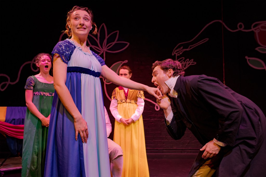 Kate Hamill’s reworking of Austen stays faithful to the plot while amplifying the laughs. There have been some trims, and a few characters have been cut (bye-bye, Kitty Bennett). Yes, it’s a bit odd to be presented with an Austen romance as an out-and-out comedy, but an irreverent take can often reveal more about the text. Purists will no doubt shriek (more on the shrieking later), but Hamill works hard for the laughs, even if it means drafting in pop culture references and modern, euphemistic readings of perfectly chaste words. Does it cheapen the source material? A bit, but Austen’s a big girl; her legacy will remain intact.
