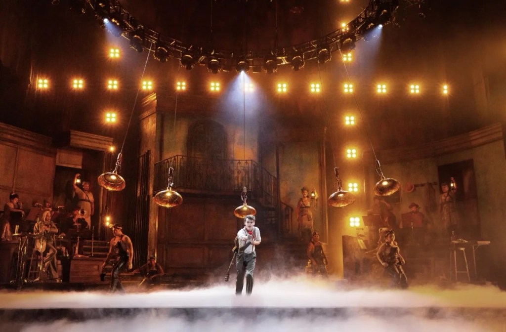 Rachael Hauk’s design continues the “Brooklyn chic” trend of shows like Once and Hamilton — all wood and exposed brickwork, with an added touch of steampunk. A giant rear lighting rig (lighting design by Bradley King) amps up the rock concert drama in a way similar to the recent Jesus Christ Superstar. Like that show, Hadestown balances between a concert/cabaret and a fully-fledged Broadway musical, with plenty of fourth-wall breaks and direct narration. The choreography by David Neumann is suitable, but the dance break in ‘Livin’ It Up On Top’ feels like it’s filling time rather than being impressive in its own right.