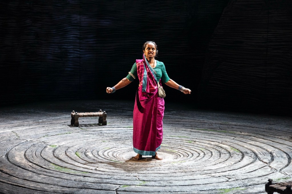 Set design by Keerthi Subramanyam is a feast of simplicity and elegance, wrapping the stage in the earthen textures of wood, accented with key pieces made from recycled materials. The tree-ringed floor grounds us in history and nature over a time span that far exceeds our mere human lives.