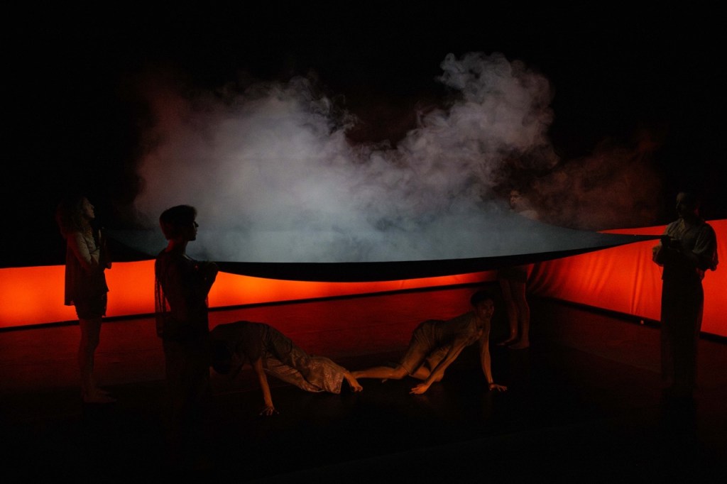 Daniel Riley plays with visual textures that have a visceral edge—from ethereal smoke that can be both beautiful and menacing, to a sheet of black fabric that introduces clean lines or a tortured, twisted body depending on how it is used. Marrow hits its peak as the dancers torture the fabric, binding it with plastic ties and hanging it from a hook while the soundtrack blasts a loud, discordant screech (as a middle-aged person, I wished I’d brought some concert earplugs). Then silence, as Karra Nam rescues the form, gently flattens it back out and cleanses it with smoke. The juxtaposition of this mournful, silent movement after the propulsive dance hits hard.