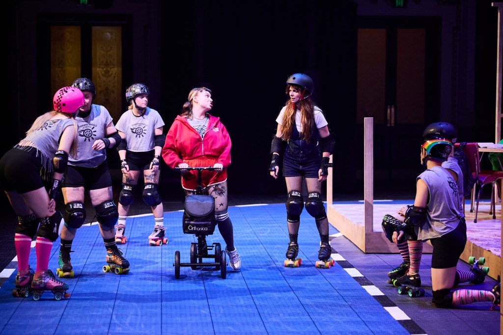 I’ll get my main criticism out of the way early — there isn’t enough roller derby in Mama Does Derby. The hard-working skaters spend almost two thirds of the show pushing the set around, and when we do get to the derby, the confines of the Town Hall seating make it all feel rather tame. I get it: crash barriers would block sightlines and eat into the space. But “derby” is in the title. I at least wanna see some argy-bargy on wheels.