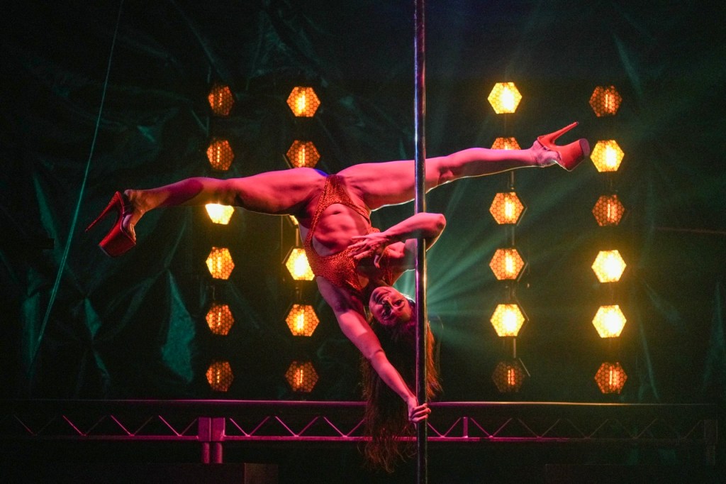 There are plenty of easy stand-outs across the evening. Lisette Krol’s muscular pole routines are consistently jaw-dropping, while Emer Dineen’s comic alter ego, the hapless DJ Drunken Disorderly, delivers big laughs.