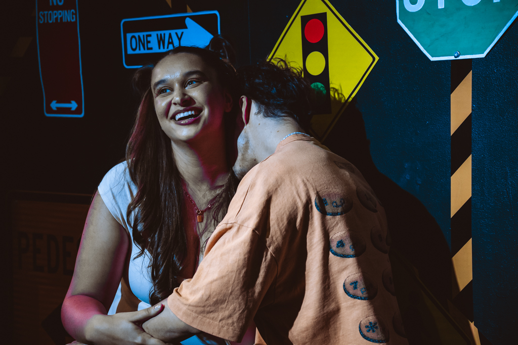 Azzopardi attacks the scenario with an abundance of style, using the “traffic” theme to set things up and play with the audience. It instantly elevates the writing, and even if it’s overused, it shows a clear voice that’s exciting to see. Similarly, director/designer Brea Macey delivers visuals with music breaks and clever staging that makes the KXT thrust infinitely rearrangeable. This is a great looking show that maximises the space and budget.