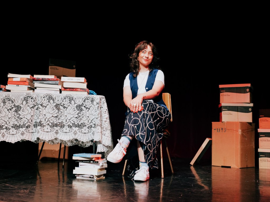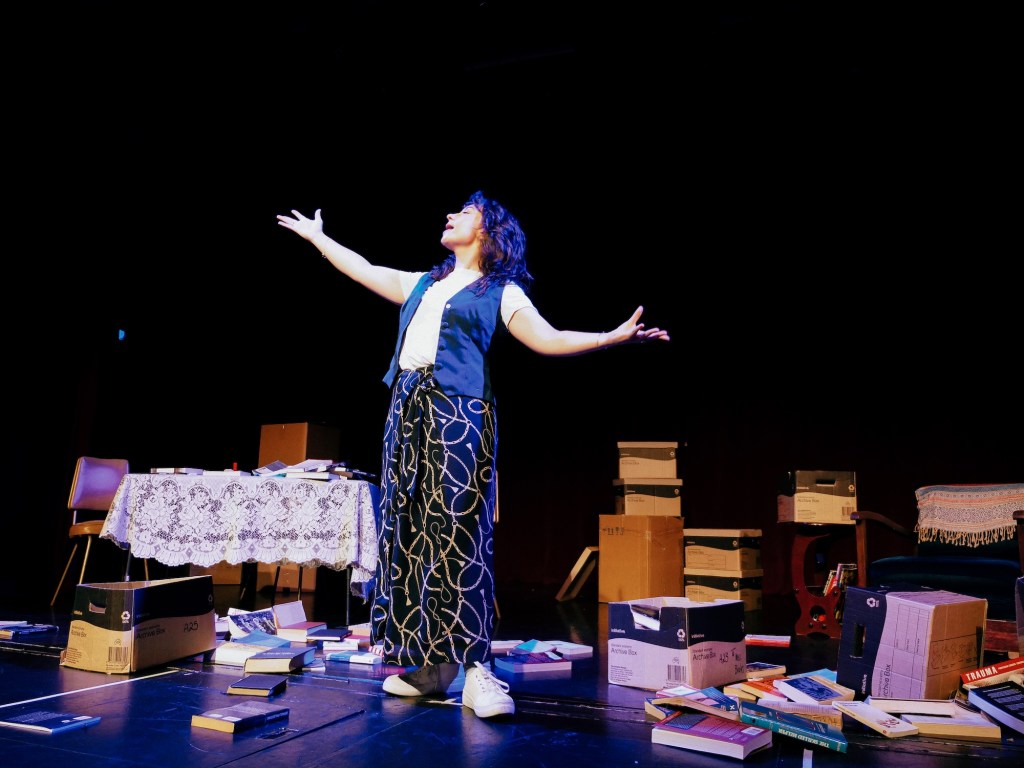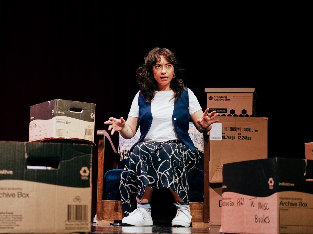 Director Kat Yates helps Paterson bring these stories to life through clever, effective staging — boxes of books strewn across the stage are deployed to a variety of ends. The one-woman show makes extensive use of audio interviews with Suzie, filling the gaps in Beth’s own recollections.