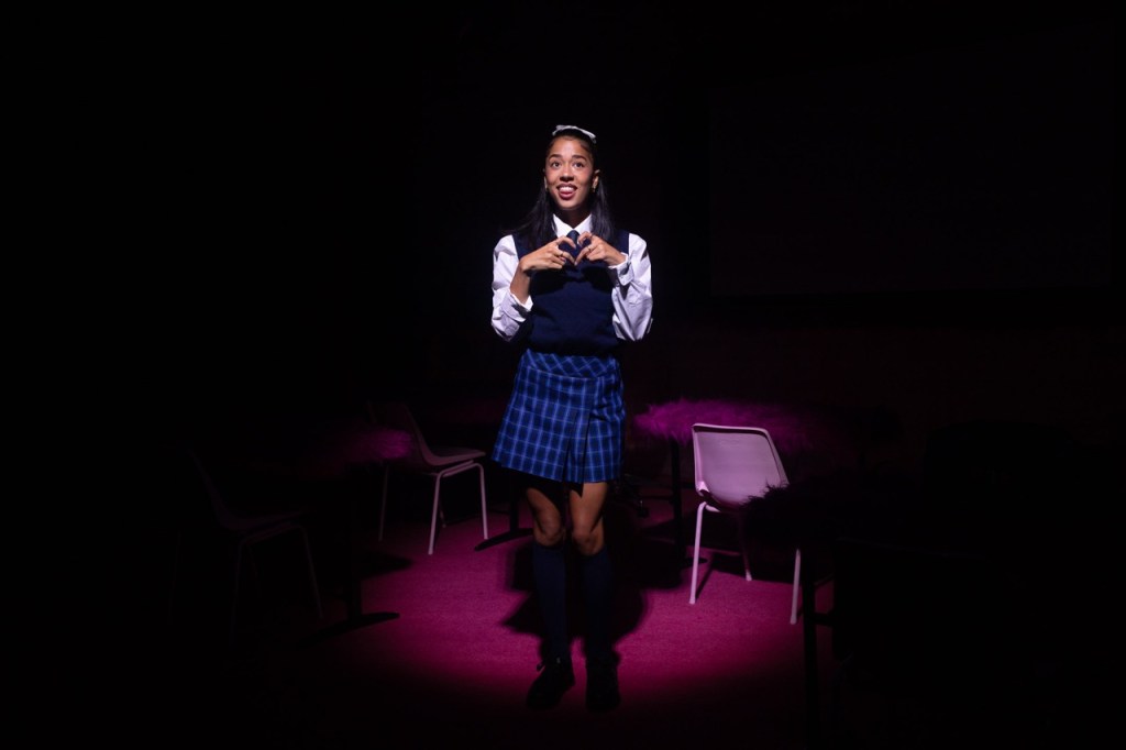 Director Ian Michael leans into the script’s maximalism with dramatic lighting cues (Kelsey Lee on lights), brash sound design (Daniel Herten on audio), multimedia captions (TK Abioye on video) and a furry pink set that puts Barbarella‘s spaceship to shame (Emma White on sets).