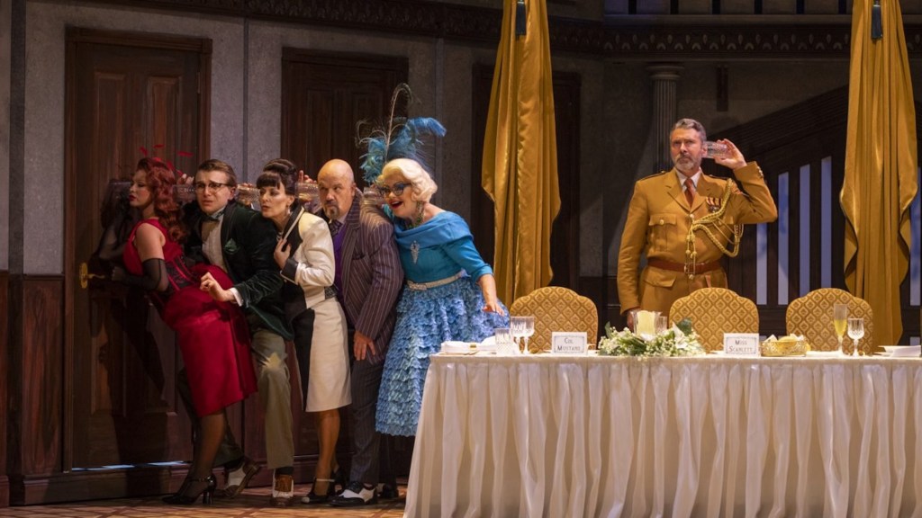 What follows is a backstabbing, Knives Out drawing-room farce, that runs at full pace the second starting pistol is fired, with the guests desperately trying to solve an ever increasing number of murders. It’s scintillatingly silly, relentlessly high energy and choreographed within an inch of its life.