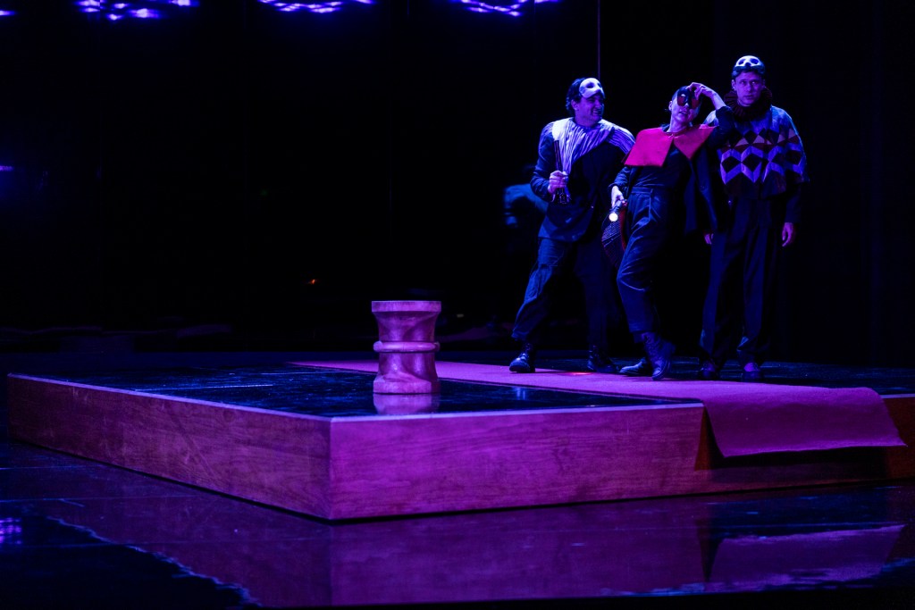 The combined work of Emelia Simcox (production design), Brockman (lighting) and Aisling Birmingham (sound) makes for a physically impressive stage space that elevates the action and the comedy. While the atmospheric scoring by the band does wonders in building tone and accenting moments, the original songs themselves fall flat. The musical numbers feel awkwardly placed and are hard to hear without any amplification — and it’s clear the majority of these performers were not cast for their singing and dancing skills. The sudden switch from folk & country to electronica mid-song, for instance, is particularly jarring.