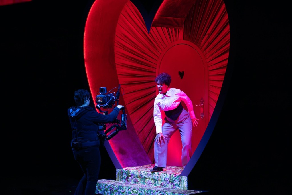 Zahra Newman and camera operator Lucy Parakhina. Photo: Daniel Boud. Dracula is aware of its own camp comedy and Newman relishes in it. The variety of character accents are each slightly ridiculous. Newman’s Dracula comes across like a mix of an 90s european raver (the red hair reminded me of Run Lola Run) and The Room’s Tommy Wiseau (“I vant to suck your blaaad”). Van Helsing looked like the wise karate teacher from a 70s blaxploitation film. When Newman dons a curly blonde wig to play Lucy Westerna the irrepressible silliness of the look gets its own hearty laugh. It’s clear the whole production team was having a lot of fun.