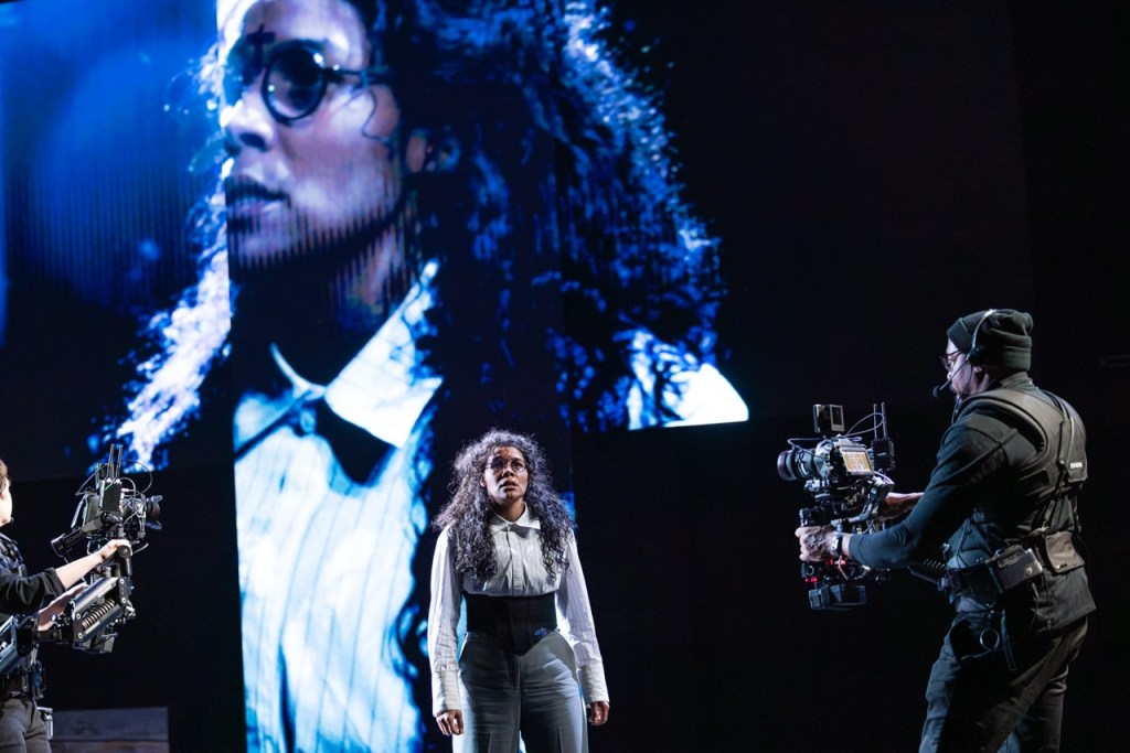 Given the supernatural nature of the story I expected more invention in the use of the cine-theatre technique, and at times the screen became a crutch. Complex scenes with multiple characters moving around each other lose their impact over time and the play becomes more traditional as we adjust. When the giant screen reaches the floor down-stage and Newman has a walking conversation with multiple versions of herself, the effect is simply two-dimensional.
