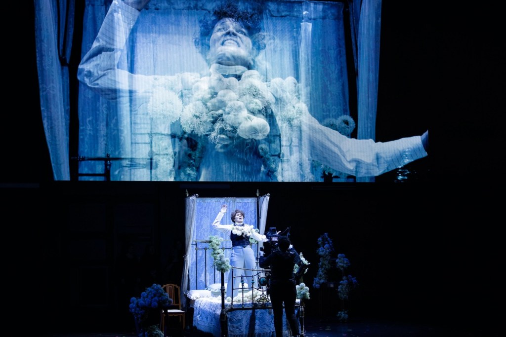 Photo supplied by Opera Australia. Taking a liberal approach to Shakespeare’s text, this opera plays with your senses to put the audience in the headspace of the Danish prince which can be a disorienting experience. The show opens with a fractured echo of the play’s Act 3 soliloquy “To be, or not to be” before throwing us into the dining hall at Elsinore. It sets the tone for an adaptation that is part deconstruction of the original, which is happy to crib from Shakespeare’s other works to make a point.