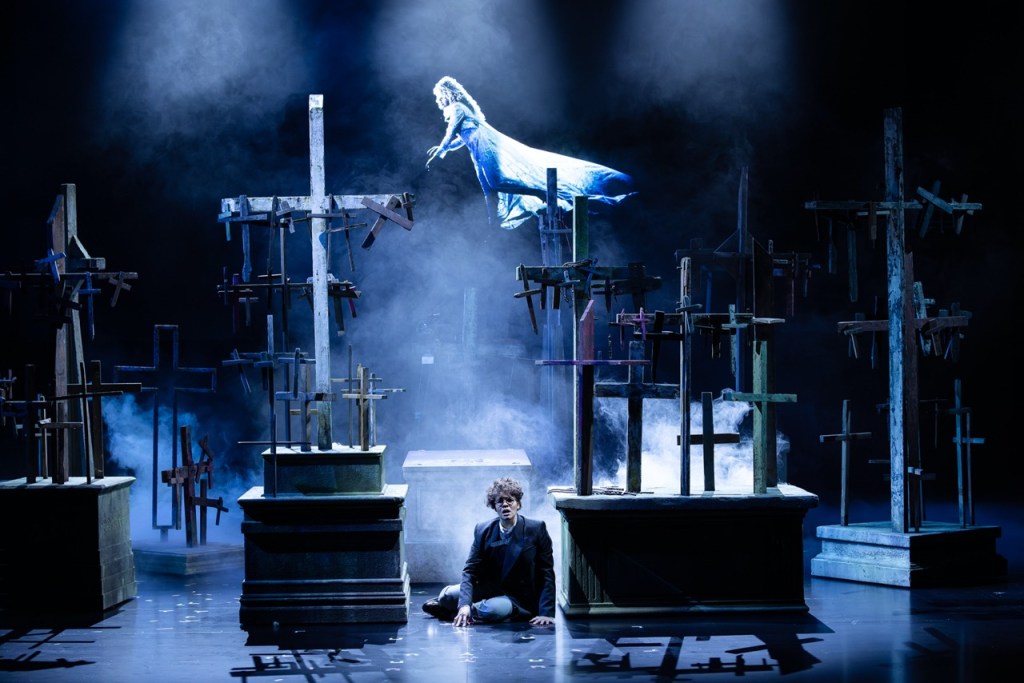 Ralph Myers’s set shifts as easily as Hamlet’s mental state, giving scenes a dream-like quality, and Alice Babidge’s costumes clearly mark each character. Armfield’s direction is as assured as always. Placing the ensemble cast around the aisles of the audience for the start of Act 2 is a master stroke. This is an opera that doesn’t stay on the stage, but gets inside your head.
