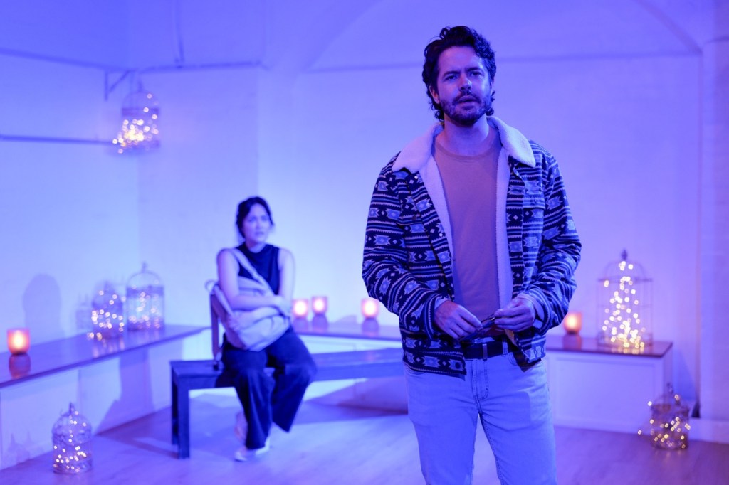 Veronica Clavijo & Jimmy Hazelwood. Photo: Syl Marie Photography. The Vault itself is a simple space, seating about 30 people in two rows, facing a corner. The stage area is given an ethereal quality thanks to tasteful lighting & simple design elements — fairy lights, birdcages, and the occasional wind chime. Washed in a purple glow, things feel otherworldly. The abstraction accentuates the actors, though there is a slightly awkwardness in their performances as they wrangle the dense dialogue that detracts from the emotion.